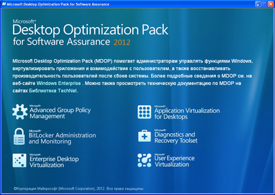 ![]() Пакет Microsoft Desktop Optimization Pack (MDOP) — это набор технологий, доступных клиентам программы Software Assurance по подписке. Пакет MDOP помогает улучшить совместимость и процесс управления (App-V/MED-V/UE-V), сократить затраты на поддержку (DaRT) и обеспечить более полный контроль над политиками (MBAM/AGPM). |