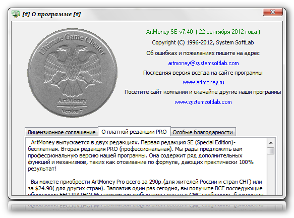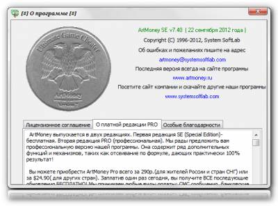 ArtMoney предназначена для редактирования параметров в компьют:ерных играх, для получения бесконечных денег, жизней, патронов и т.п. Она умеет сканировать память или файлы игры для поиска каких-то определенных значений (деньги, ресурсы и т.д.). Таких значений может быть много и надо выбрать нужные, поэтому поиск разделяется на два этапа - поиск значений и отсев ненужных значений. В итоге получаем адреса, в которых находятся числа, и их можно изменить на нужные. |