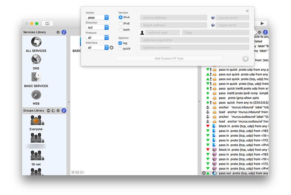 Murus Pro усовершенствованное и удобное приложение для PF, которое позволяет легко создавать сложную конфигурацию брандмауэра. Кроме того, Murus Pro предлагает дружественный интерфейс для межсетевого экрана PF и поставляется со встроенной поддержкой фильтрации и предварительными настройками.